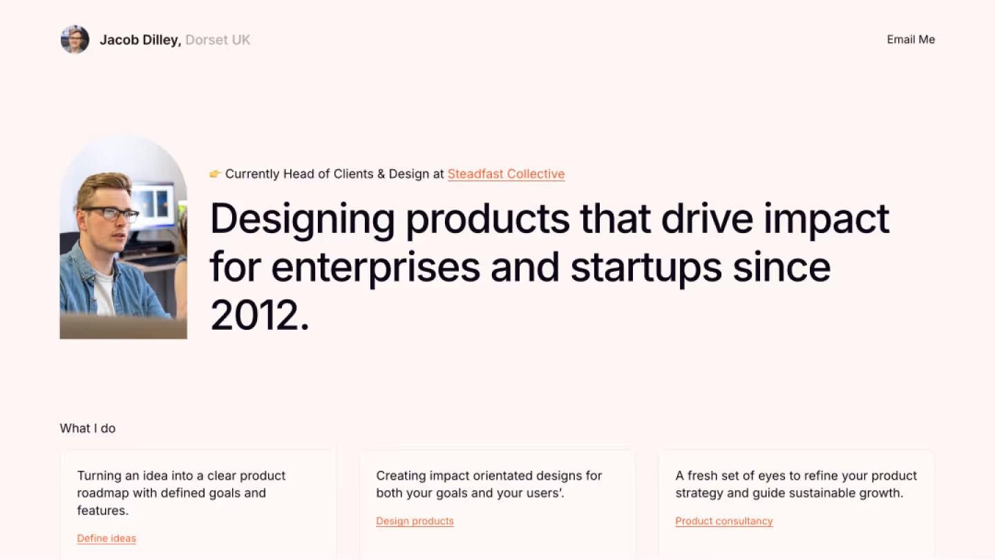 Jacob Dilley is a versatile product designer with expertise in UX design, UI design, visual design, and product strategy. With experience freelancing and working with Steadfast Collective, he excels in product discovery and user research, using tools like Figma to craft user-centered designs that balance aesthetic appeal with functionality.
